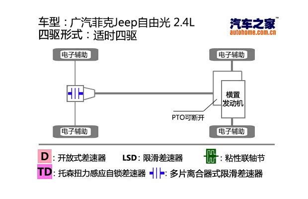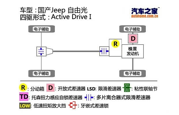 自由光的Active Drive智能四驱系统基于AAM(American Axle & Manufacturing美国车桥)公司EcoTrac四驱系统, 它主要由PTU(取力器)和RDM(后驱动模块)两部分组成。PTU与变速箱相连接,能够在0.2s内传递或断开动力至RDM,已达到节油的目的。RDM通过TTD(扭矩管理器)来实现扭矩在前、后轮间的动态分配。而TRAIL HAWK版较普通自由光车型在脱困性能方面有了更明显的提升,它增加了分动箱,可实现2.92倍的扭矩放大功能,而且还配备了电控可完全锁止的机械锁(结构为双多片离合结构),可以完全将扭矩100%传递给另一侧车轮,最大限度帮助车辆脱困。