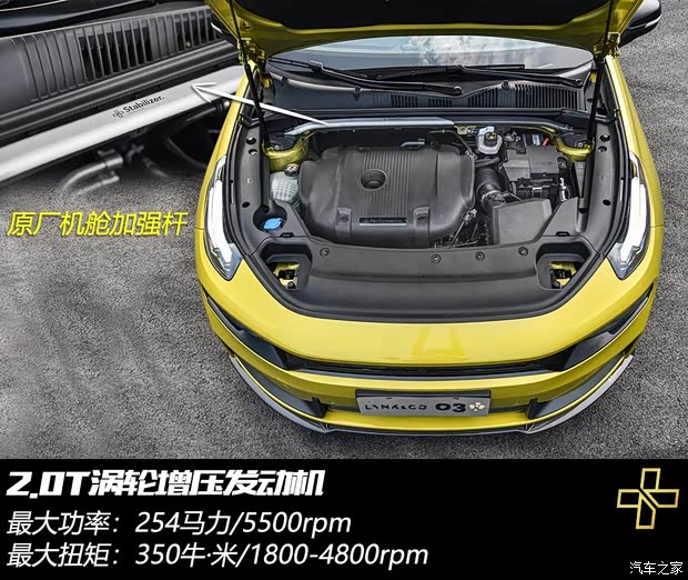 领克03+配备2.0T涡轮增压发动机,最大功率254马力(187kW)/5500rpm,最大扭矩350牛·米/1800-4800rpm。传动系统部分,与发动机匹配的是来自爱信的第三代8AT变速箱。